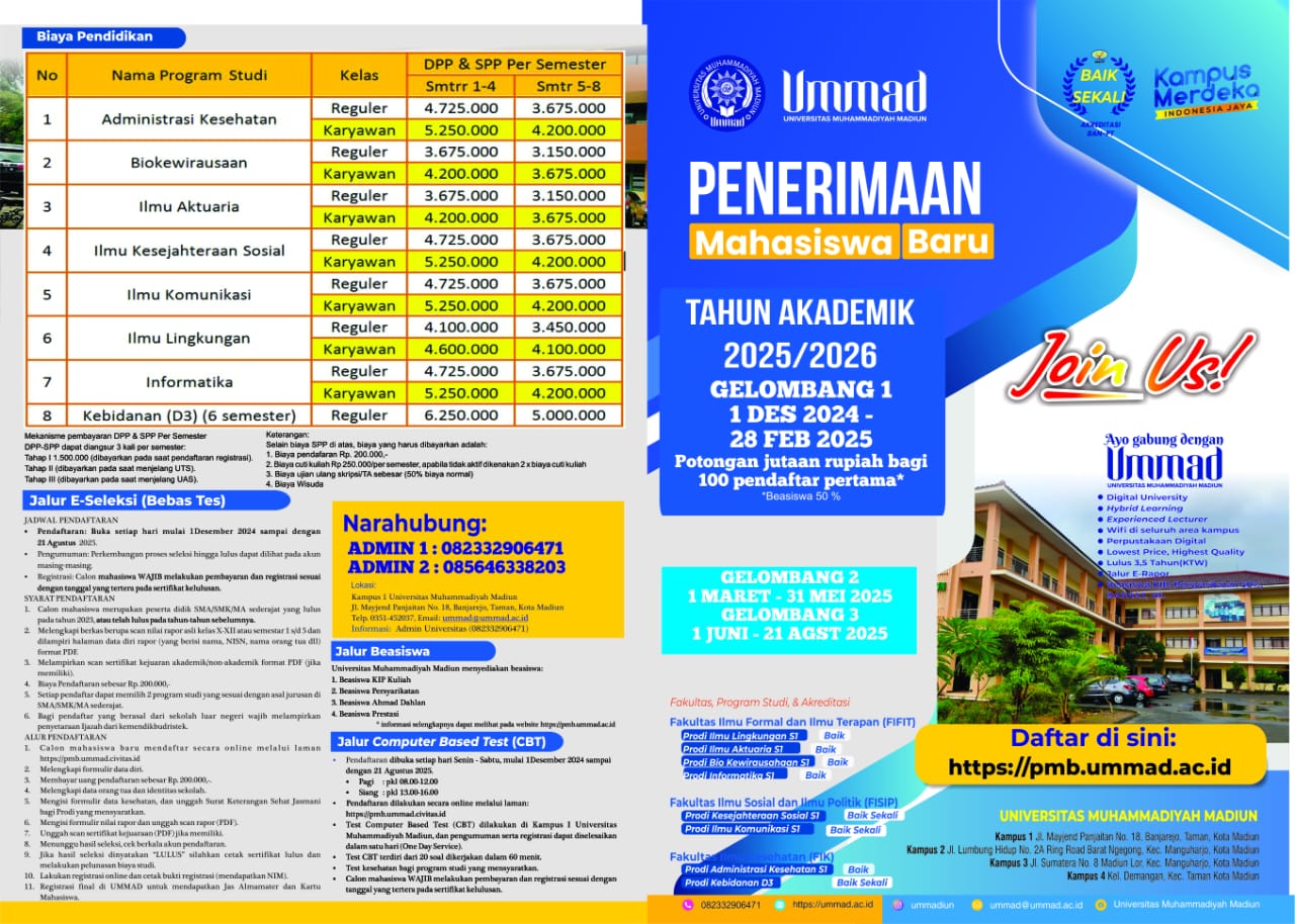 Rakhma menjelaskan, biaya kuliah di UMMAD sangat terjangkau. Biaya kuliah di UMMAD mulai Rp. 3.675.000 tiap semester yang bisa dibayar 3 kali. “Kami membuka WA center di admin 1 (08233290647) dan admin 2 (0856466338203),” terang Rakhma